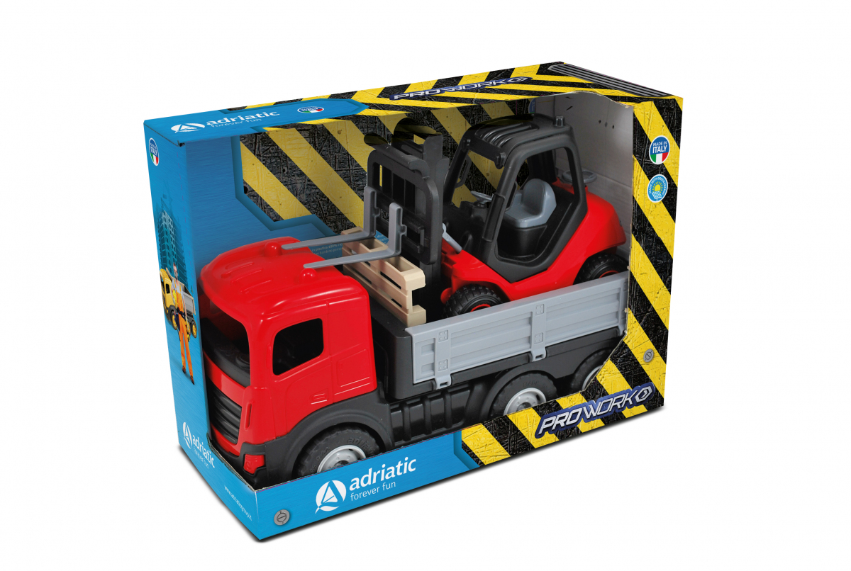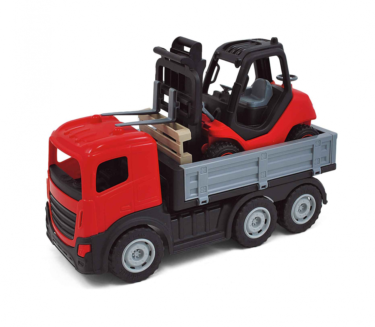 Solidna, wielofunkcyjna ciężarówka z naczepą wyposażona w realistyczny wózek widłowy oraz paletę transportową. Zestaw odwzorowuje prawdziwe pojazdy logistyczne, co sprzyja kreatywnej zabawie i rozwija wyobraźnię dziecka. Idealny do zabawy w piaskownicy, na plaży oraz w ogrodzie.