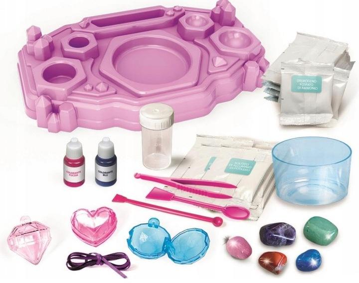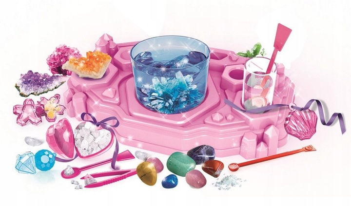 Kompletny zestaw edukacyjny, który pozwala dzieciom odkrywać fascynujący świat kryształów i kamieni szlachetnych. Umożliwia przeprowadzanie eksperymentów chemicznych, tworzenie gigantycznych kryształów oraz własnych, lśniących ozdób do kolekcjonowania lub noszenia.