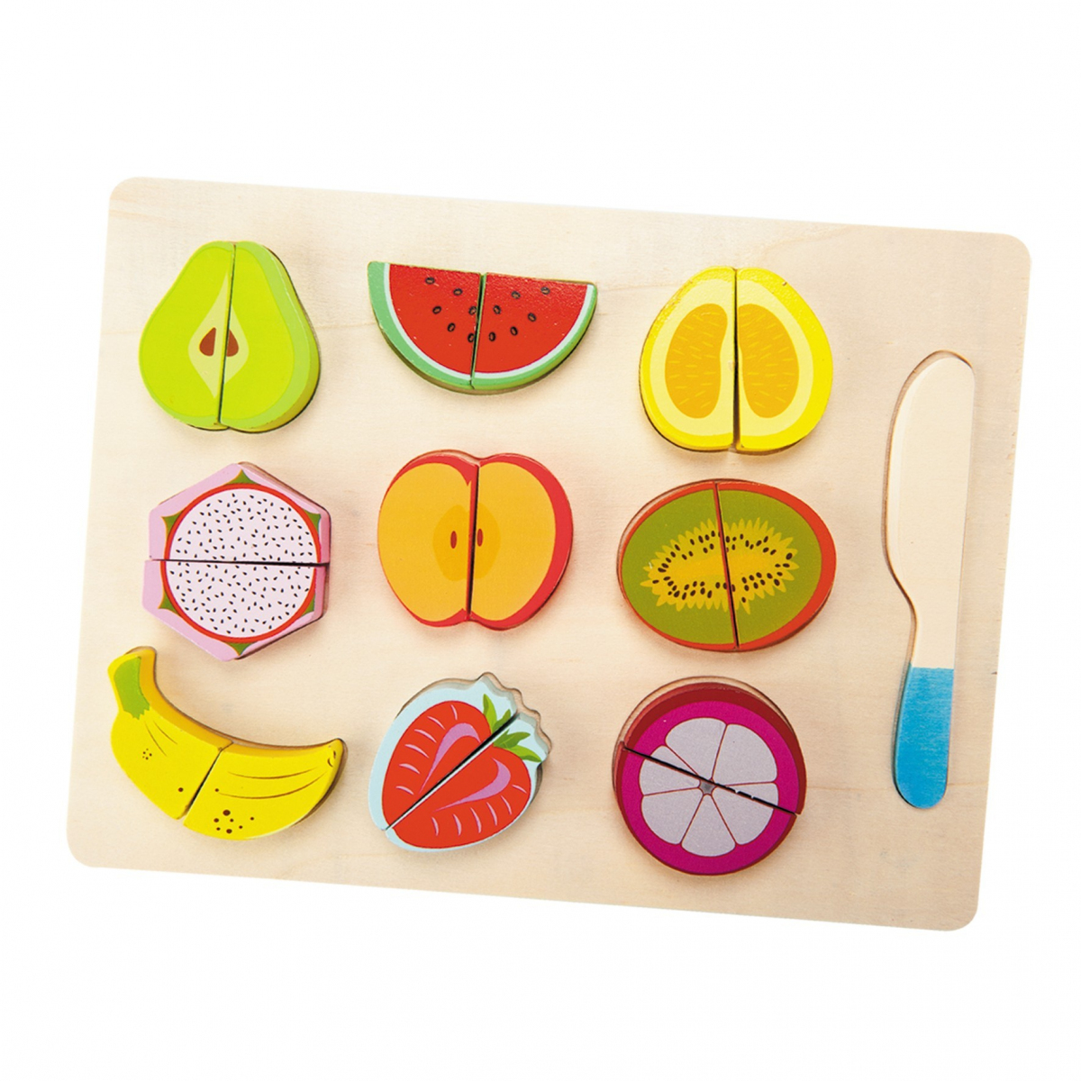 Zestaw drewnianych owoców i warzyw dla uatrakcyjnienia zabawy w kuchni. Żywa kolorystyka z pewnością przyciągnie uwagę dziecka i zachęci je do zabawy w sklep, zakupy na straganie czy gotowanie. Ponad to, precyzyjne odwzorowanie kształtów owoców i warzyw ułatwi dziecku ich rozpoznanie oraz nazwanie. Wszystkie owoce i warzywa posiadają wewnątrz rzep, który umożliwia przekrojenie danego artykułu na pół za pomocą dołączonego noża oraz ponownego złączenia, co dodatkowo uatrakcyjnia zabawę.