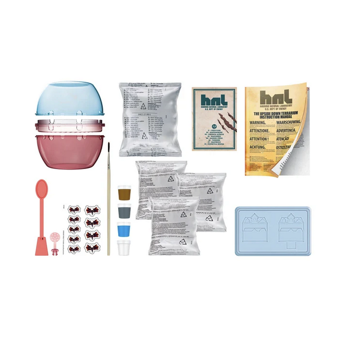 Zestaw zawiera wszystkie dodatki, takie jak pojemnik, nasiona, glina, gips, foremki i farby do stworzenia zatrważającej scenografii.