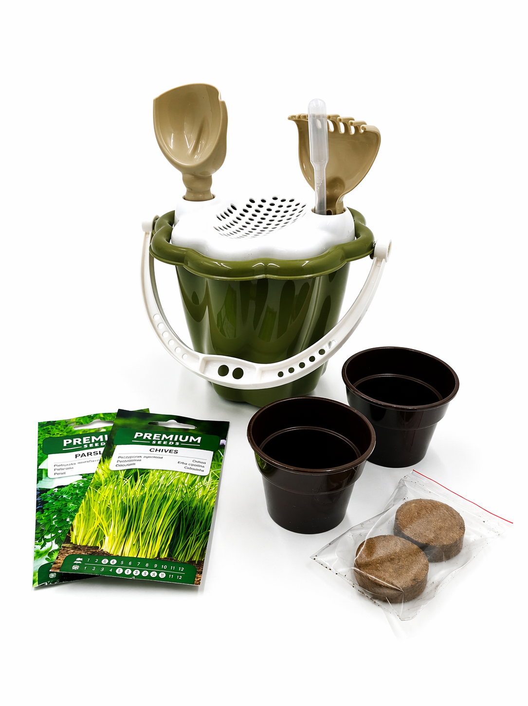 Każde wiaderko zawiera kompletny zestaw do rozpoczęcia uprawy:
